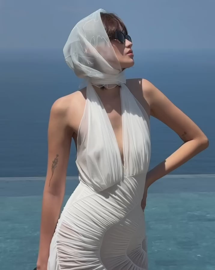 A dress that feels like modern couture. The Plot Twist White Sheer Halter Maxi Dress is designed to sculpt the body while creating a light, ethereal silhouette that moves beautifully with every step. Crafted from delicate sheer fabric, the dress features architectural pleating that curves around the waist and hips, creating a striking spiral effect that accentuates your shape.