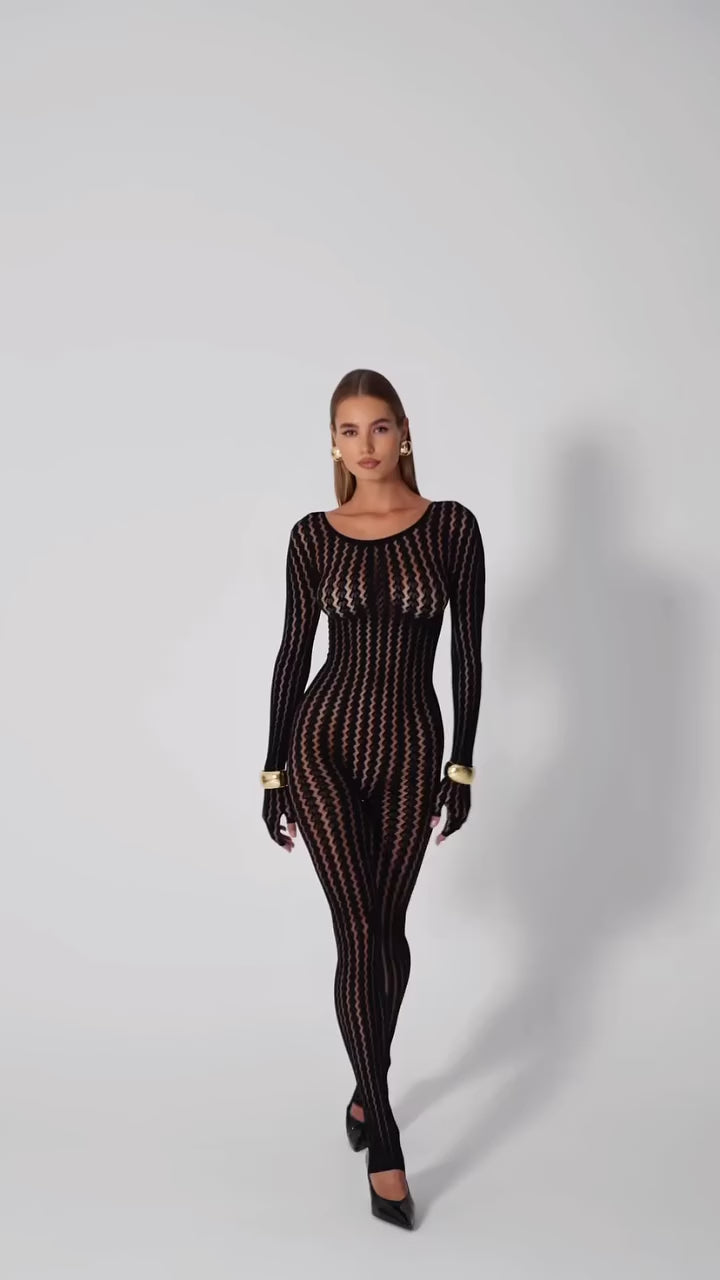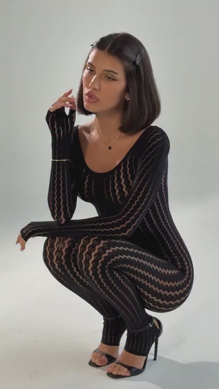 Unveil your silhouette in the Real You Mesh Jumpsuit — a statement piece that merges sensuality with architectural precision. Crafted from a soft, stretch-knit lace with a hypnotic zigzag pattern, it sculpts the body like a second skin while revealing subtle glimpses of bare skin beneath.